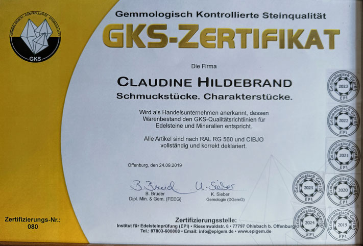 GKS (Gemmologisch Kontrollierte Steinqualität) ist ein Kontrollsiegel für gehobene Edel- und Schmucksteinqualitäten.