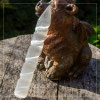Selenit, ein sehr weicher Stein, ist ein Fasergips und sollte deshalb nur kurz unter Wasser gereinigt werden, besser auf Hämatitsteinchen oder einer Amethystdruse. Wie die meisten Steine lässt er sich gut bei Vollmond aufladen oder auf einer Bergkristallstufe. Bitte nicht in die direkte Sonne legen.